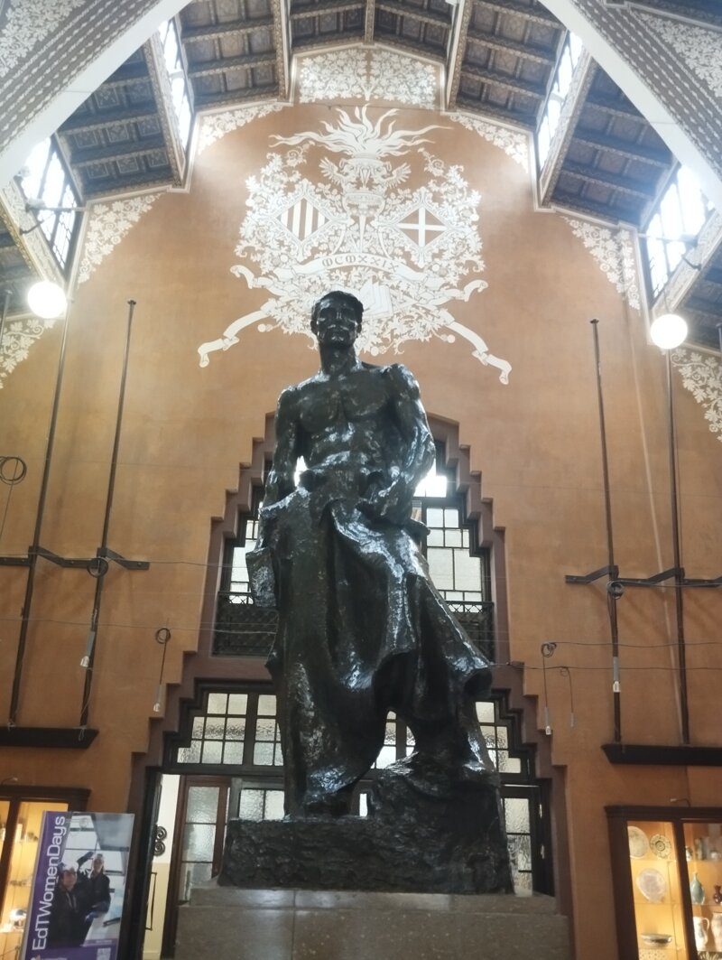 La obra se levanta en el centro del vestíbulo de la Escola del Treball de Barcelona. Este espacio, reformado entre 1927 y 1931 por Joan Rubió i Bellver, combina elementos del modernismo con las formas claras y ordenadas características del noucentisme.